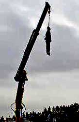 crane and hoisted into the air 30 or 40 feet above the street for all to see